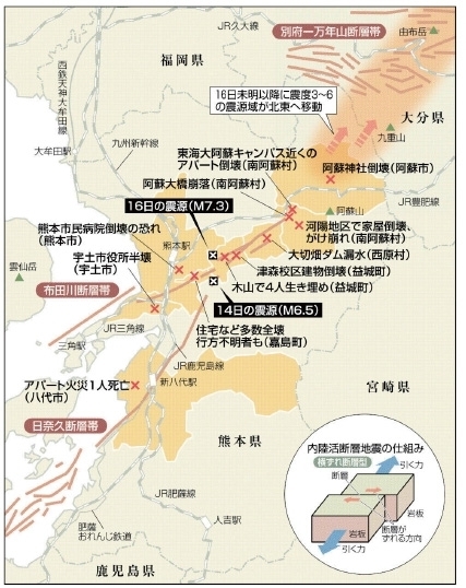 ![]() 2016.4.17西日本新聞 地震と原発 2016.4.16 日本の断層 日経新聞 2016.4.16西日本新聞 (1)九州大震災 *1-1、*1-2、*1-3のように、2016年4月14日午後9時26分に発生したマグニチュード(M)6.5の地震に続き、4月16日午前1時25分頃にはM7.3の地震があり、その後、大分県も震源域となり、震源は上図のように中央構造線付近を移動しており、これは、九州内陸部過去100年の地震で最大規模だそうだ。 気象庁は、「①このような規模の地震が広域的に続発するのは記憶にない」「②震源3つは前例がない」と述べているが、地殻変動の周期は長いため、①は、どの範囲の記憶のことを言っているのか不明で、②は、前例のあることしか起こらず既存の断層帯以外は決して断層にならないという保証はないため、現在は断層がないからといって安心はできない。 また、地震は、本震とその他に分けて名前をつけることにあまり意味はなく、それより重要なのは、どういう理由でこれらの地震が起こったかである。何故なら、それがわかれば、さらに大きな地震がくるのか、火山噴火の可能性は高いのか、九州で歪(ひずみ)を解消すれば一連の地震が終わるのかがわかるからだが、それを解説した報道は今までにない。 そして、気象庁火山課は、*1-4のように、「熊本県阿蘇中岳で噴煙が第1火口から約100メートルまで上がった小規模な噴火があったが、地震との関連を明確に示すデータはない」とし、火山噴火予知連絡会副会長の石原京大名誉教授も「阿蘇山は地震前から噴火活動が続いており、このところの火山性微動のデータを見ても活発化する要因が見当たらない。今のところは、たまたま同じ地域で地震と噴火が重なったと見ていい」としている。しかし、本当に活発化する要因はないと言えるのだろうか? 日本の火山は、(簡単に書けば)下図のように、太平洋プレートやフィリピン海プレートがマントルの動きによって北米プレートやユーラシアプレートの下に押し込まれ、流体のマグマが地上近くに上がってきて起こるものだ。これは、プレートの境界と火山帯の分布、日本列島の地形を見ればわかることで、ユーラシアプレート・フィリピン海プレート・北米プレート・太平洋プレートが押し合っている日本アルプス付近は、飛行機から見ると山脈がまさに地殻の皺のような形をしており、他の山脈も似たようなものである。 この現象を、GPSで証明したのが下の右図で、九州では中央構造線付近で力の向きが変わり、フィリピン海プレートがユーラシアプレートの下に押し込まれる力の影響を受けているのがわかる。そして、東日本大震災後の太平洋プレートの沈み込みは海山などの障害が取れたらしくて速くなり、太平洋プレートがフィリピン海プレートを押す力が増して、それに連動して火山の噴火や地震が増えたのだと思われる。 ![]() マントルの動き・造山運動・日本を取り巻くプレート GPSによる 移動距離の測定 ![]() プレートの沈み込みとマグマ GPSによる移動距離の測定 なお、この地震で、*1-5のように、いつもは慎重な九州JRで新幹線が脱線し、その場所は想定外の区間だったそうだが、災害はどういう形でやってくるかわからないため、「想定外」はよくない。また、*1-6のように、この地震によって、南阿蘇村で大規模な土砂崩れがあり、阿蘇大橋や俵山トンネルが崩落し、国道57号線やJR豊肥線が寸断され、熊本城や熊本神社も被害を受けているそうである。 (2)稼働を止めない川内原発 交通系が念のため運航停止して確認したのに対し、*2-1、*2-2のように、川内原発は設備損傷などの異常は確認されていないとして、通常運転を継続している。しかし、誰がどの程度の確認をして「異常なし」と言っているのか、運転中に配管のひび割れまで確認できるのかについては疑問がある。 また、「異常は確認されていない」というのも、確認しなかっただけでなかったと言えるわけではなく、施設内の装置で自動停止基準内だったという程度であるため、原発を扱う事業者としての慎重さに欠ける。 そして、*2-3、*2-4、*2-5のように、熊本県を中心に震度7の地震に襲われ、最大震度6強の余震が140回を超える中、九電は全国で唯一稼働する川内原発1、2号機の運転を継続しており、原子力規制庁は「安全上、問題はない」との認識を示し、政府もそれを容認しているが、「より大きな地震の発生もあり得る」と指摘する地震学者もおり、一つ一つの揺れが自動停止基準の震度5を超えていなくても、揺れる回数が多ければ配管等の部品が痛んでくるため、安全という保証はなく、運転継続は危険だと考える。そのため、フォトジャーナリストの広河隆一さんら文化人6人が4月16日に、川内原発の即時停止を求める要請文を九電に送ったそうだ。 (3)地震と原発 日本は、*3-1のように、プレートの重なりの上にできた国であり、地震が多い。仮に、私たちが、生まれてから今まで経験したことのない揺れだったとしても、日本の成り立ちから考えれば年中起こ