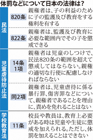 ![]() 2019.2.17毎日新聞 2013.3.2Yahoo 2015.12.26産経新聞 (図の説明:左図の民法822条、児童虐待防止法、学校教育法に書かれている“懲戒”の定義は不明だが、言葉が穏やかでないため教育目的のしつけに限るべきだろう。しかし、中央の図の“懲戒”の例には、①教室への居残り ②教室内に起立 ③宿題・清掃を課す ④遅刻した子を試合に出さない などが書かれており、右のグラフには、懲戒・体罰を行ったことで処分を受けた公立学校の教員が著しく増加した様子が出ているが、この“懲戒”は、教育目的に入る例も多そうだ。なお、中央の図で、体罰の例として挙げられているものは、言語によるコミュニケーションやディスカッションなど他の方法を使うべきだ) (1)心愛さん(10歳)のケース 千葉県野田市で、*1-1のように、10歳の娘を虐待して死亡させた父親が、“傷害”容疑で逮捕され、その暴行を止めずに共謀していた母親が傷害容疑で逮捕され、その虐待の様子は動画で撮影され父親の記録媒体に保存されていたというから、このケースは特に父親が異常人格なのであろう。そして、母親も子どもを護るという親の役割を果していないだけでなく、父親に協力して子どもを虐待しているのが変なのである。 心愛さん自身は、2017年9月以降に通っていた千葉県野田市の小学校で、「父親からいじめを受けた」「叩かれるなどの暴力を受けている」と訴え、野田市は2017年11月に学校からの連絡で虐待の疑いを確認して柏児童相談所は心愛さんを一時保護したが、家庭での養育が可能と判断して両親の元に帰してしまった。 その後、心愛さんは殆ど学校に来ておらず、休む理由も不自然で、心愛さんの体には日常的虐待をうかがわせる複数のあざがあったというから、それでも気付かなかったというのなら児童相談所(以下“児相”)は役割を果たせていない。これに関して、「忙しかった」という弁解は、結果の重大性から見て通らないだろう。 心愛さんは、2017年9月に沖縄県糸満市から千葉県野田市の小学校に転入し、そこで父親からの暴力を訴えて、柏市の児童相談所に一時保護された後、親族の家に預けられ、2018年3月上旬に自宅へ返されている。そして、柏児童相談所は心愛さんが自宅に戻ってから一度も面会しておらず、心愛さんが通っていた小学校の校長も、「担任の先生からあざやけがなどの報告はなかった」とし、家族関係はうまくいっていると認識していたとのことである。 野田市の警察は、野田市からの報告で心愛さんが保護対象であることは把握していたものの、「直ちに対応するべき案件ではない」と判断していたそうで、警察が被害者を守れずに死に至らしめるケースはストーカー事件など多く、これは日本の警察の人権意識の低さに由来する。 一方、沖縄県糸満市の記録によれば、一家は2009年に糸満市に転入して2017年8月まで住んでおり、市内に母親の実家があり、心愛さんは近くの小学校に1年~3年1学期末まで通っていた。容疑者から児相に直接電話があったのは2017年7月7日で、「祖父母が娘を返してくれない」という内容で、児相の担当者は「児相が支援できるか検討したいので来所してほしい」と求めたそうだ。この場合、糸満市の児相は、何故、祖父母が返さないのか、祖父母や心愛さんからも話を聞くのが当たり前だと考える。 しかし、沖縄県糸満市には、*1-2のように、母親へのDV被害等について聞き取った記録はなく、当時通っていた小学校では、母親へのDV情報は校長、教頭、担任の三者に留っていたそうだ。個人情報に当たるため、ちょっと相談したら学校中(もしくは町中)に知れ渡り、永久に記録に残るのではうっかり相談もできなくなるが、相談された人は責任を持ってアクションをとる必要があったと考える。 (2)結愛ちゃん(5歳)のケース 2018年3月に、目黒区で児童虐待によって結愛ちゃんが、*2のように、父親に虐待されて死亡した事件についても、両親は、5歳の子どもには無理なことを要求して虐待している。 2016年12月に香川県の自宅前で結愛ちゃんが唇から出血した状態で放置されており、児童相談所は一時保護したが、2017年2月には一時保護を解除して自宅に戻している。そして、2017年3月に再度放置され、児相が2度目の一時保護を行い、2017年4月に幼稚園を退園したが、2017年7月には一時保護を再び解除している。 2017年8月に結愛ちゃんが父親に蹴られたと病院が市に通報もしていたが、2018年1月に一家は東京に引っ越し、香川の児相から東京の児相にそれまでの経緯や情報を伝えていたにもかかわらず、結愛ちゃんは父親の暴行を受けて搬送先の病院で死亡した。 これも、異常なのは父親と母親であって結愛ちゃんではない。また、このように明確なケースでさえ子どもを保護できずに死亡させたのは、児相の役割を果たしておらず、途中で転居があったとしても弁解の余地はない。 (3)解決策は正しいか? *2には、「児童虐待数は25年間で約120倍に増えているが、里親や施設数は殆ど変