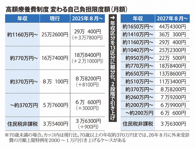 患者の医療費を一定額に抑える高額療養費制度の見直し案が24日固まった。1カ月の自己負担の上限額を2027年8月までに今より4~38%引き上げる。現役世代らの保険料負担の圧縮効果は累計1600億円ほどで、石破茂前政権時代の当初案から半減する。患者団体への配慮で改革は大きくしぼんだ。上野賢一郎厚生労働相と片山さつき財務相が24日、26年度予算案の閣僚折衝で合意した。いま主に5つある所得区分について、まず26年8月に1カ月の上限を引き上げる。住民税非課税の層は4~5%、それ以外は7%ずつ上げる。住民税非課税を除く4つの区分を27年8月にそれぞれ3つに細分化して12区分とした上でさらに限度額を上げる。現状より7~38%の引き上げとなる。住民税非課税の人は26年8月以降は据え置く。27年の細分化で新たにできる年収約650万~770万円の区分の患者は、引き上げ幅が最も大きい。11万400円と、いまの8万100円から38%上がる。高額療養費制度では、がんや難病などで長期療養中の患者の負担を抑える「多数回該当」と呼ぶ制度がある。1年に3回、月額上限を超えたら4回目以降は下げる仕組みだ。毎月の限度額引き上げで対象から外れる患者の負担増を考慮して、26年8月に「年間上限」の仕組みを設ける。所得区分に応じて18万~168万円に設定する。70歳以上の一部が使える「外来特例」も負担を引き上げる。例えば年収がおよそ200万~370万円の患者だと今は月1万8000円を払えば何度でも通院できる。2年後に2万8000円となるよう段階的に上げる。「通い放題」となる制度が医療費を膨らませる一因になっているとの指摘があった。健康寿命の伸びを踏まえ対象年齢の引き上げを26年度以降に改めて検討する。もともと高額療養費制度の見直しは、石破前政権が24年末に公表した。患者団体の強い反発を受けて最終的に全面凍結に至った。政府は今回の改革で保険料負担を累計1600億円ほど圧縮できると見込む。石破政権時代の当初案は3700億円だった。高齢化で医療費が一段と膨らんでおり、現役世代の負担軽減につながるか不透明な面もある。24日の閣僚折衝では市販薬と成分や効果が似る「OTC類似薬」について、27年3月から患者から上乗せ料金を徴収する方針も決まった。77成分(約1100品目)は患者に薬剤費の4分の1を追加負担させる。保湿剤のヒルドイドやうがい薬のイソジン、抗アレルギー薬のアレグラなどが対象になる見通しだ。栄養保持を目的とした食品類似薬も26年6月から保険給付の扱いを変える。通常の食事で栄養を補給できる患者が食品で代替できるものを使った場合は給付を外す。後発医薬品が普及した薬の先発薬を希望する患者から上乗せ料金をとる制度も同時期に負担割合を引き上げる。こうした政策で累計1000億円の保険料負担の抑制を目指す。介護保険制度改革では、利用料の2割負担の対象者拡大について年内に結論を出すのを見送ると正式に決めた。閣僚折衝の合意書で、27年度から始まる新たな介護保険事業計画の前までに「結論を得る」と記すにとどめた。