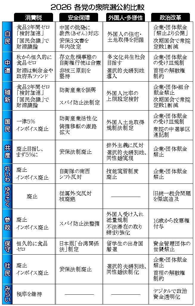 外国人政策を巡り、日本の人口に占める外国人割合に上限を設ける「受け入れ規制」の是非が、衆院選(8日投開票)の争点に浮上している。政策見直しを掲げる各党の中で、日本維新の会や参政党などが必要性を主張する一方、自民党は言及していない。中道改革連合は慎重姿勢を示す。政府は1月、外国人政策の基本方針をまとめた「総合的対応策」を決定。日本国籍取得の要件厳格化や医療費不払いの対策強化、土地取得の法的ルール整備などを盛り込んだが、受け入れ規制は今後の検討事項にとどめた。出入国在留管理庁によると、2025年の外国人入国者数(速報値)は4243万人と過去最多を更新。国立社会保障・人口問題研究所は、70年に外国人比率が1割を超すとの推計を発表している。国内の外国人が急増する状況を踏まえ、維新は「上限設定」を「本丸」と位置付け、参政も「受け入れ総量の厳格化」を提起。日本保守党は「移民はいったんストップ」と訴える。自民公約は、政府の総合的対応策を踏襲した内容で、受け入れ規制には触れなかった。深刻な人手不足を背景に、受け入れ拡大を望む経済界などに配慮したとみられる。国民民主党は防衛施設周辺以外も対象とした「外国人土地取得規制法」の制定を打ち出す。チームみらいは入国税や非居住外国人の固定資産税を引き上げると提案。減税日本・ゆうこく連合は「ルールを守らない外国人に厳しく対処する」としている。これに対して中道、共産、社民各党は共生社会の実現に力点を置く。中道の野田佳彦共同代表は総量規制について「時期尚早ではないか」と指摘。「多文化共生庁」の設置などを検討する考えを示す。共産、社民は「差別や排外主義に反対」の立場を強調する。れいわ新選組は外国人の権利を侵害するような「移民政策」に反対している。SNS上でも外国人政策への関心は高い。分析ツール「ブランドウォッチ」でX(旧ツイッター)の投稿を検証すると、「移民」を含むポストが首相の衆院解散表明の前後から急増。参政や保守の支持層によるとみられる「自民は移民推進」との投稿も目立つ。