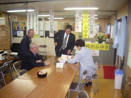 自民党がまとめた「魅力ある地域へのガイドマップ」を持って、 田崎のぶゆき選挙事務所へ、陣中見舞いに行きました。 候補は遊説中で留守だったので、後援会の方に内容を説明し、 候補が当選した後は、プロジェクトを協力してやっていきたいこ とや、演説の中にその内容を織り込めば、時流に乗った、内容 の濃い演説ができることなどをお話してきました。