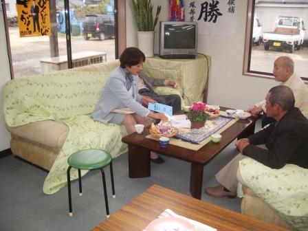 自民党がまとめた「魅力ある地域へのガイドマップ」を持って、 松尾真介選挙事務所へ、陣中見舞いに行きました。 候補は遊説中で留守でしたので、後援会の方に内容を説明し、 候補が当選した後は、プロジェクトを協力してやっていきたいこ とや、演説の中にその内容を織り込めば、時流に乗った、内容 の濃い演説ができることなどをお話してきました。