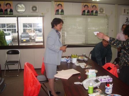 自民党がまとめた「魅力ある地域へのガイドマップ」を持って、 山口隆敏選挙事務所へ、陣中見舞いに行きました。 候補は遊説中で留守でしたので、お母様に内容を説明し、候 補が当選した後は、プロジェクトを協力してやっていきたいこと や、演説の中にその内容を織り込めば、時流に乗った、内容 の濃い演説ができることなどをお話してきました。 お母様は、自民党暦30年のベテランで、品のいい美人でした!