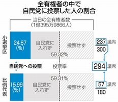 ![]() 図1(*1より) 図2 (1)原発ゼロは否定されたのか? 図1のように、59.8%の人が「原発は0にする」という政策に賛成であったにもかかわらず、明確に原発ゼロを掲げた政党の議席数は28.0%しかなかった。これには、もちろん議席獲得のマジックもある。しかし、自民党は、原発ゼロに反対だったのかと言えば、反対はしておらず、さらに電力自由化を公約にしていた。そして、本当に電力自由化が進めば、私が、このブログの2012年11月24日、9月2日に記載したとおり、原発はコストが見合わないため消滅した上、電気料金は下がる。従って、私は、自民党は、覚悟を持って徹底した電力自由化を行い、電力市場に公正な競争を導入すべきだと思うし、そのためのインフラを最小のコストで整備すべきである。そして、そこまで考慮した人を含めれば、原発ゼロの方針は総選挙でも否定されていない。 (2)消費税増税反対は否定されたのか? 消費税増税反対の人が55.6%いたにもかかわらず、消費税増税をしないという公約を掲げた政党の議席数は、12.0%に留まった。これは、消費税増税に賛成か、反対かという1点で賛否を問う選挙ではなかったので、①マニフェスト等の実行力で自民党に投票したが、消費税増税には反対だ ②他のテーマを優先して消費税増税反対をしている政党に投票しなかった という人も多いだろう。つまり、争点を1点に絞って投票しているわけではないので、そのテーマでの民意と選挙結果がずれることはある。また、官僚が背後で操って、こういう結果を導いていることもある。 (3)憲法9条改正反対はどうだったのか? 憲法9条改正反対の人は41.4%いたが、議席数は16.0%しかなかった。その差は大きいが、その理由は、憲法9条改正反対をしているのが、主に共産党、社民党であるため、世界ではすでにマルクス主義や共産主義・社会主義が淘汰されている現在、選択しにくい政党だからだと思う。しかし、マルクス主義、共産主義、社会主義を主張している点を除けば、両党は、一般の人が賛成しやすいことを言っている場合が多いため、私は、両党が世界の歴史に合わせて共産主義や社会主義を主張するのをやめてはどうかと思う。そして、*2については、阿部知子さんは、環境や生命を大切にし、まともなことを言う方であるため、阿部さんを中心として「緑の党」を作ってもよいではないかと思った。 安部さんは、党派を超えて、表舞台から下ろすには惜しすぎる人材だからである。 なお、私自身は、憲法は9条2項のみを改正して自衛隊に関する超法規的な憲法解釈をやめ、自衛隊を軍としてきちんと定義して防衛できるようにした方がよいと思っている。戦後生まれで戦争をしたいと思っている人はいないので、憲法改正や集団的自衛権についても、そろそろ国民の前で議論して、その意図や内容を明確に示すべき時だろう。 (4)選挙制度について 図2のように、投票率が59.3%で低かったため、第三局に投票しがちな浮動票が少なかったと思われる。そうなると、確固たる支持基盤を持つ自民党や民主党の候補に有利だ。また、小選挙区制では得票数が1番の人以外は当選しないため、当選者以外の候補への票は死票になり、議席数と民意が比例しない。さらに、自民党は選挙に慣れており、長く政権を担っていたため、支持団体のボランティアも団結が強く、選挙を手伝い慣れているということもある。また、支持してくれた団体には、予算や政策で返すことができるため、実際には純粋なボランティアではないということもあろう。 では、中選挙区制の方がよいのかと言えば、対象地域が広くなるため、ポスターやビラの印刷枚数がそれだけ多く、選挙に多くの金がかかる。そうすると、金があり、慣れたボランティアを動員できる人しか立候補できないため、当選者も普通の人とはかけ離れた人になりそうだ。 *1:http://www.tokyo-np.co.jp/article/politics/news/CK2012121702000259.html (東京新聞 2012年12月17日) 脱原発 世論6割、当選3割 3大争点すべてズレ 衆院選では、原発政策とともに大きな争点だった消費税増税や憲法九条でも民意と選挙結果に隔たりのある結果となった。本紙が公示直前に行った世論調査と、東京都の二十五選挙区に立候補した百三十四人を対象に行ったアンケートを比較するとその差は歴然としている。 原発では、世論の約六割が原発ゼロを訴えていたが、東京の二十五選挙区でも自民党候補が続々と勝利。当選した自民党の中にはアンケートで「原発ゼロ」と答えた候補もいたが、二十五人の中で脱原発を求める当選者は28%にとどまった。 消費税増税について世論調査では反対が55・6%で、半数を超えていた。消費税増税は民主党と自民、公明両党の三党の枠組みで決めた。マニフェストで約束していなかったのに増税を決めた民主党は、世論の批判をまともに受けて惨敗。しかし、その代わり自民党が小選挙区で躍進し、公明党も議席を獲得したため、結局、増税勢力が多数を占めた。 憲法九条は、世論調査では
