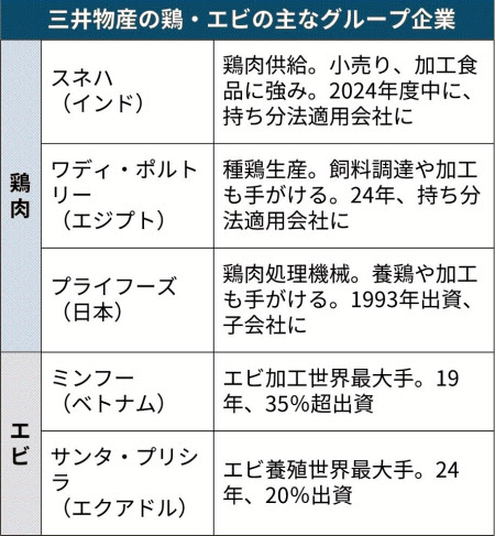 三井物産が動物性たんぱく質の確保を急いでいる。インドや南米、アフリカなどで鶏肉やエビの現地大手企業へ相次ぎ出資し、生産段階で二酸化炭素(CO2)排出が比較的少ないたんぱく資源の供給網を構築する。人口増加で拡大する世界の胃袋を満たすことと、持続可能な食材供給の両立に商機があると見込み、成長の活路を見いだす。