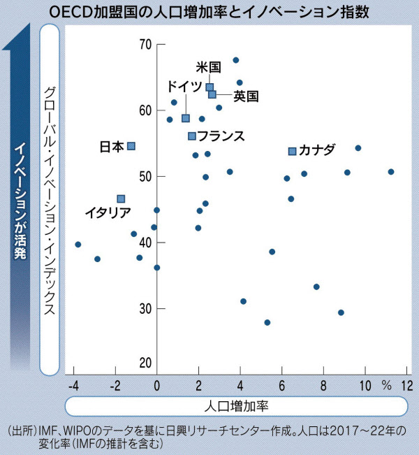 (図の説明:1番左の図は、主要国の1990~2021年までの名目1人当たりGDPの推移で、左から2番目の図は、2022年の主要国名目1人当たりGDPだが、この2つから、日本は名目でも著しく順位を下げたことがわかる。また、右から2番目の図は、購買力平価による1人当たりGDPの推移で、購買力平価による日本の伸びも他国と比較して緩やかだ。1番右の図は、人口増加率とイノベーションの関係で、OECD諸国ではこの2つに相関関係のないことがわかる)